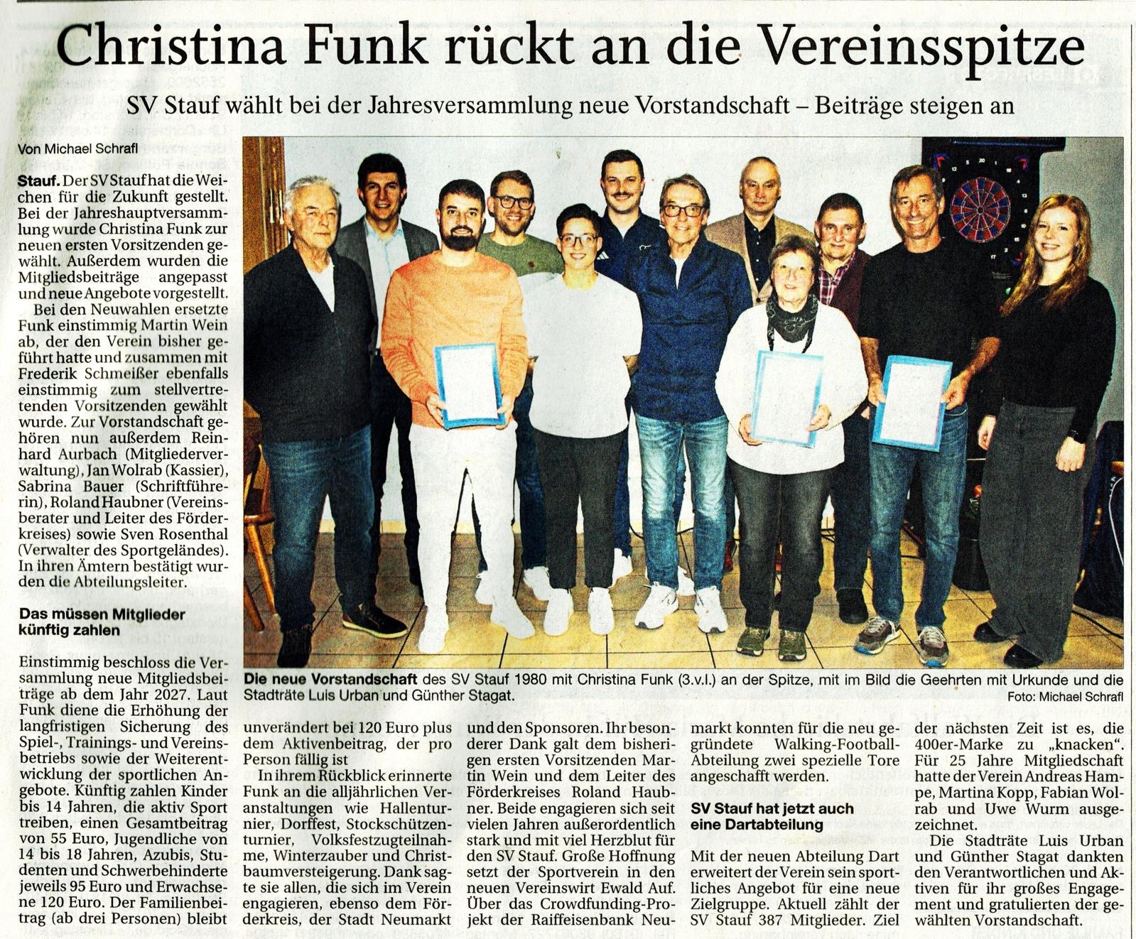 Bei der Jahreshauptversammlung am Freitag, den 18. März wurde Martin Wein einstimmig zum neuen 1. Vorsitzenden des SV Stauf gewählt. Ebenso erhielten die 2. Vorsitzende Christina Funk und der 3. Vorsitzende Helmut Mundschedl die Stimmen aller 35 Versammlungsteilnehmer.