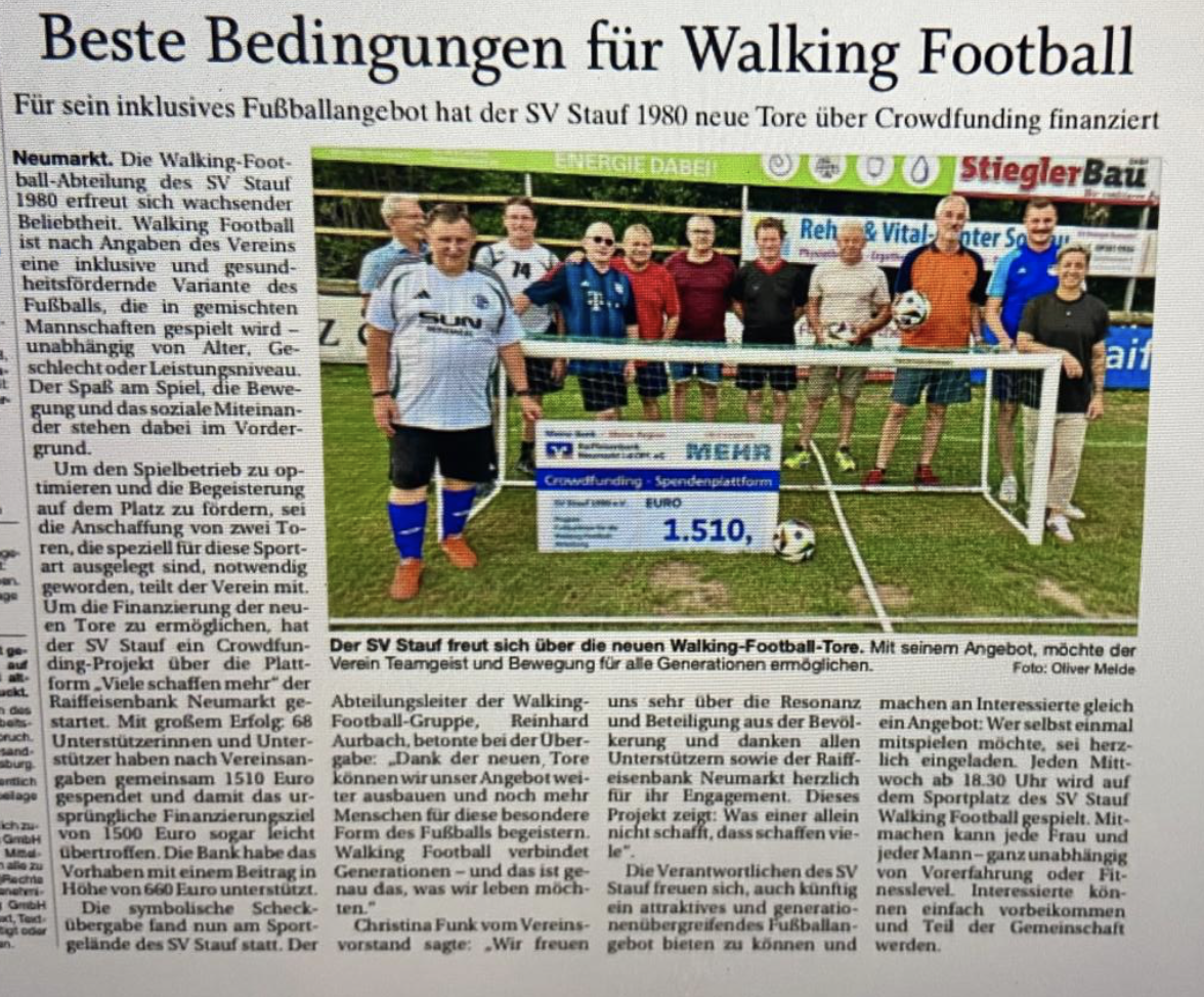 Der SV Stauf 1980 e.V. hat für seine neu gegründete Walking-Football-Abteilung ein Crowdfunding-Projekt bei der Plattform „Viele schaffen mehr“ der Raiffeisenbank Neumarkt i.d.OPf. eG gestartet, um zwei spezielle Tore (3 × 1 m) anzuschaffen.